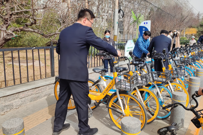團員青年們來到華騰新天地商場南門,將雜亂停放的共享單車擺放整齊,并引導(dǎo)前來停放共享單車的人們規(guī)范停放,優(yōu)化商場的周邊環(huán)境,避免商場周邊因為隨意停車造成的交通混亂和安全隱患。