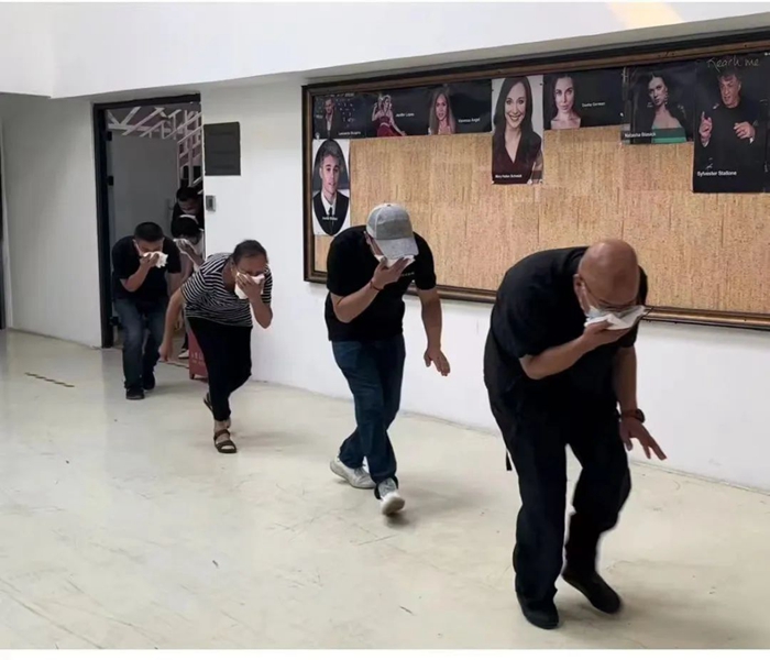 突然出現(xiàn)的“火情”讓辦公大樓“濃煙滾滾”,隨著警報(bào)的響起,只見辦公人員用濕毛巾捂住口鼻,放低身位,沿著消防通道指示標(biāo)志魚貫撤出辦公大樓……
