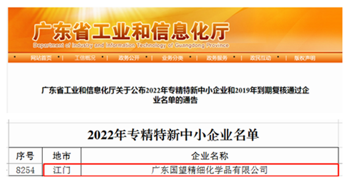 春節前夕,從廣東傳來好消息,華騰新材所屬廣東國望精細化學品有限公司成功入選廣東省2022年“專精特新”中小企業名單,成為北京化工集團第6家“專精特新”企業。