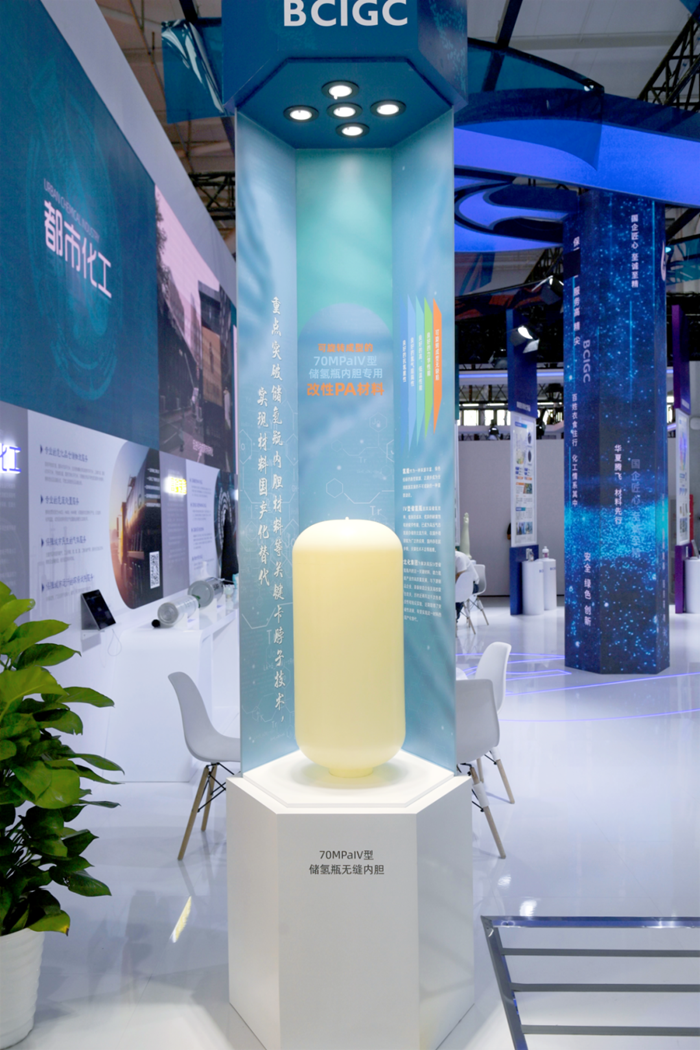 剛剛邁入北京化工集團展位所在的4號展廳,在大門左側,近1米高的儲氫瓶內膽吸引了觀展人群的目光,由集團所屬華騰京研公司正在研制的,重點突破儲氫瓶內膽關鍵材料等 “卡脖子”技術的內膽實物,將人們引進北京化工集團的展位。